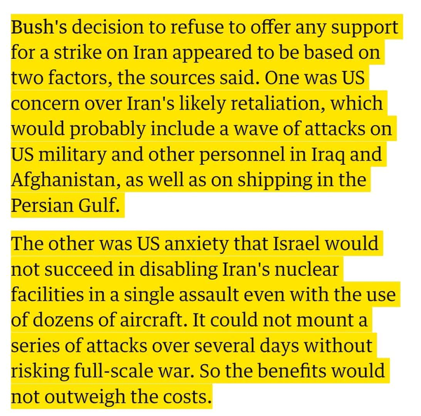 چرا آمریکا چراغ سبز نداد؟ دو عامل تعیینکنندهسؤال این است که چرا آمریکا، با وجود همراهی سیاسی و تمرینهای نظامی، در نهایت به اسرائیل مجوز حمله نداد؟گاردین در ادامه همان گزارش ۱۷ سال پیش علت را اینگونه شرح میدهد: «منابع گفتند که تصمیم بوش برای امتناع از ارائه هرگونه حمایتی برای حمله به ایران، ظاهراً مبتنی بر دو عامل بوده است. یکی نگرانی ایالات متحده از انتقام احتمالی ایران بود که احتمالاً شامل موجی از حملات به ارتش و سایر پرسنل آمریکایی در عراق و افغانستان و همچنین کشتیرانی در خلیج فارس خواهد بود. دیگری نگرانی ایالات متحده از این بود که اسرائیل حتی با استفاده از دهها هواپیما، در یک حمله واحد موفق به از کار انداختن تأسیسات هستهای ایران نخواهد شد. اسرائیل نمیتوانست بدون خطر جنگ تمام عیار، چندین حمله را در طول چند روز انجام دهد. بنابراین مزایا بر هزینهها غلبه نخواهد کرد.»این دو عامل ـ یعنی توان انتقام ایران و ناتوانی اسرائیل در اجرای عملیات موفق ـ همان دو ستون اصلی بازدارندگی ایران هستند که طی دو دهه بعد، بهمراتب تقویت شد.