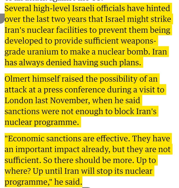 گاردین؛ طرح چراغسبز اسرائیلاگر به عقب برگردیم، میبینیم که رسانههای معتبر غربی نیز در همان سالها گزارشهایی درباره تلاش اسرائیل برای کشاندن آمریکا به جنگ منتشر میکردند.روزنامه گاردین در گزارشی که «قدمت آن به ۱۷ سال پیش باز میگردد» با تیتر«اسرائیل از آمریکا برای بمباران مراکز هستهای ایران چراغ سبز خواسته بود»نوشت: «چندین مقام ارشد اسرائیلی در دو سال گذشته اشاره کردهاند که اسرائیل ممکن است به تأسیسات هستهای ایران حمله کند تا از توسعه آنها برای تأمین اورانیوم کافی در سطح تسلیحاتی برای ساخت بمب هستهای جلوگیری کند.»گاردین سپس به سخنان علنی «ایهود اولمرت» اشاره میکند؛ نخستوزیر وقت اسرائیل که صراحتاً در لندن مطرح کرده بود: «تحریمهای اقتصادی مؤثر هستند. آنها همین الان هم تأثیر مهمی دارند، اما کافی نیستند. بنابراین باید بیشتر باشند. تا کجا؟ تا زمانی که ایران برنامه هستهای خود را متوقف کند.»این جمله نشان میدهد که تلآویو، همزمان دو مسیر «فشار اقتصادی» و «گزینه نظامی» را بهطور موازی پیش میبرده و اختلاف میان دولت آمریکا و رژیم صهیونیستی درباره احتمالات شکست و یا پیروزی حمله بوده، نه اصل حمله.گاردین ادامه میدهد: «افشاگری مبنی بر اینکه اولمرت صرفاً برای ترساندن ایران تهدید نکرده، بلکه این گزینه را آنقدر جدی گرفته که با بوش در میان گذاشته، نشان میدهد که مقامات اسرائیلی چقدر نگران شدهاند.»