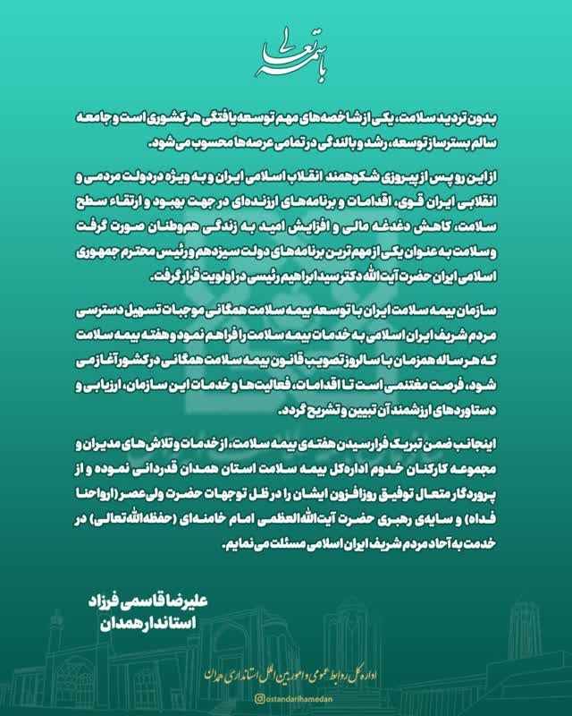 حامی ایرانیان-همدان-استاندار محترم همدان به مناسبت فرا رسیدن هفته بیمه سلامت پیامی صادر نمودند.