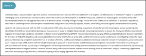 همانطور که اشاره شد در متن مرکز اطلاعات مالی، این مرکز به چرایی قرارگیری لبنان اشاره کرده است. این مرکز اشاره میکند که باتوجهبه برنامه ارزیابی دورهای صورتگرفته از سوی «مناافایتیاف» (گروه منطقهای FATF در کشورهای عربی)، FATF لبنان را در لیست خاکستری قرار داده است. چرا که در گزارش «مناافایتیاف» به آسیبهای مبارزه با پولشویی و تأمین مالی تروریسم در لبنان اشاره شده است و FATF تا حل این آسیبها لبنان را در لیست خاکستری قرار داده است.